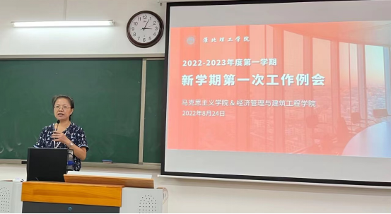 为确保新学期各项教学安排有效落实,扎实推进下半年教学重点工作,8月24日下午3点,经济管理与建筑工程公司和马克思主义公司全体教师在一教215召开开学工作会议,两院全体教职工参加会议,吴玲经理主持本次会议。会议共分为四个环节有序进行。