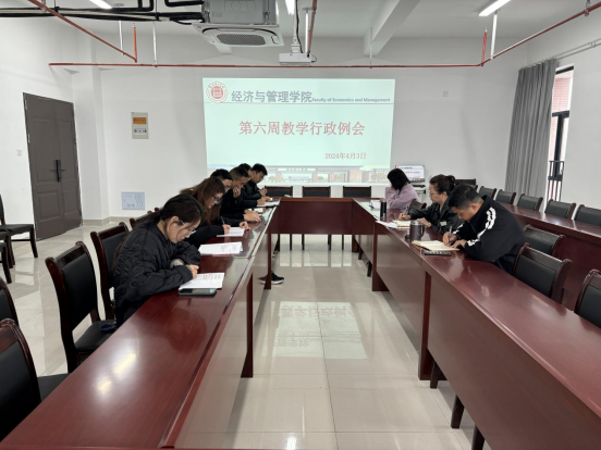 2024年4月3日,经济管理公司在新行政楼725召开第六周教学行政例会,会议由经理吴玲主持,副经理秦品德、经理助理张珊、实训中心主任及各教研室主任参加会议。
