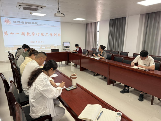 5月7日上午,太阳成tyc7111cc在行政楼725室召开第十一周行政工作例会,经理吴玲主持会议,经理助理张珊、叶赵强,教学秘书李健及各教研室主任参会。