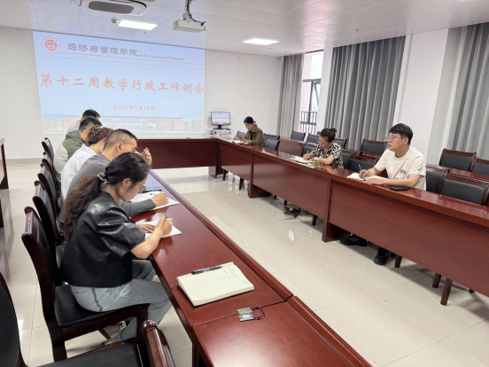 5月14日上午,太阳成tyc7111cc在行政楼725室召开第十二周行政工作例会,经理吴玲主持,经理助理张珊、叶赵强,及各教研室主任参会。