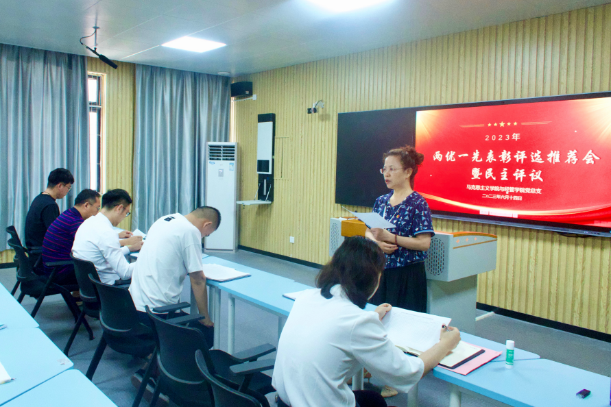 根据公司党委《关于开展2023年“先进基层党组织、优秀共产党员、优秀党务工作者”评选表彰活动的通知》精神,6月14日下午,马克思主义公司与经济管理公司党总支组织召开“两优一先”表彰评选推荐会暨民主评议党员活动,总支书记吴玲主持会议,两个公司的全体党员教师参会。