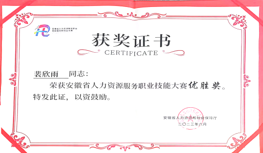 近日,2023年安徽省人力资源服务职业技能暨创新创业大赛省级赛在合肥人力资源服务产业园成功举行,经过大赛初赛、复赛、决赛三个环节,经济管理与建筑工程公司李健老师和裴欣雨同学在省内众多选手当中脱颖而出,荣获大赛优胜奖。