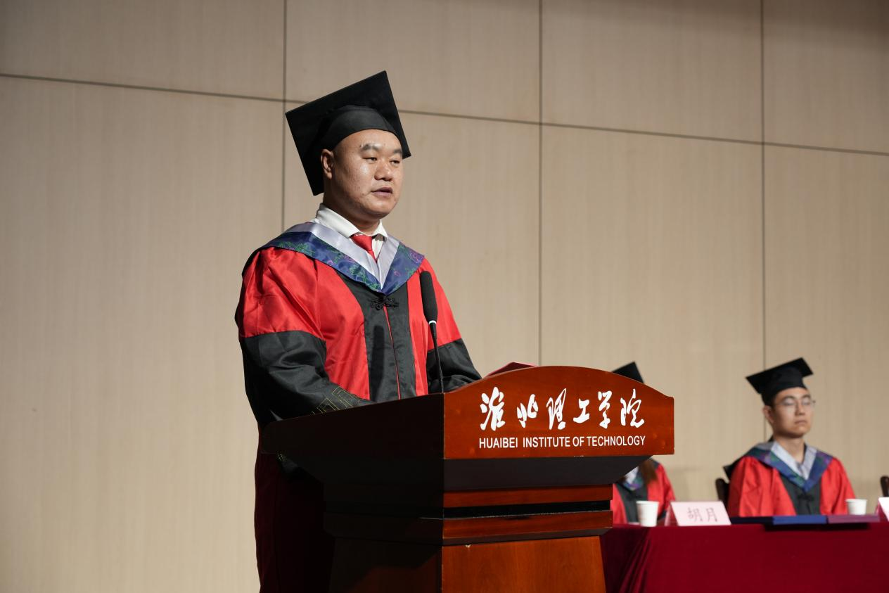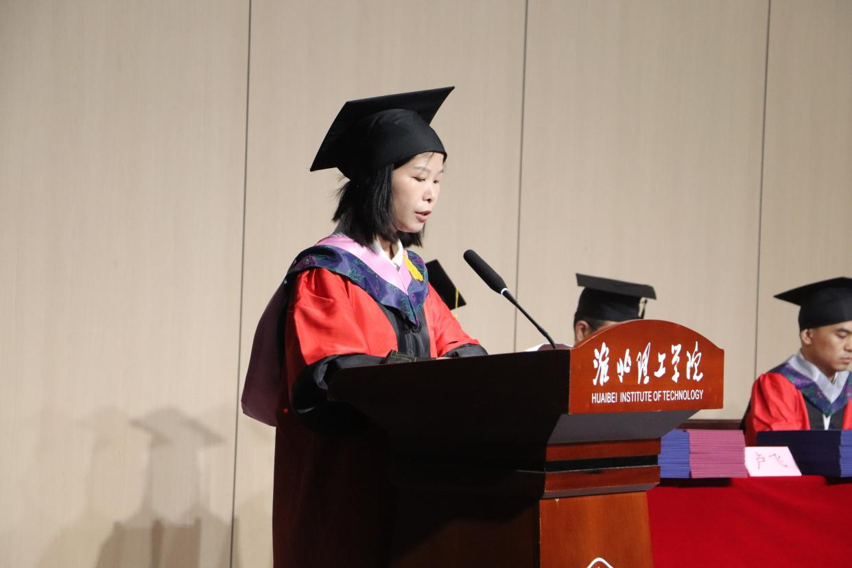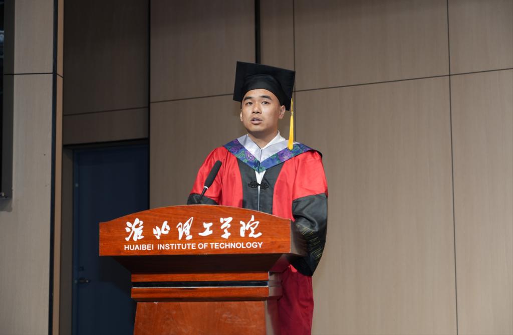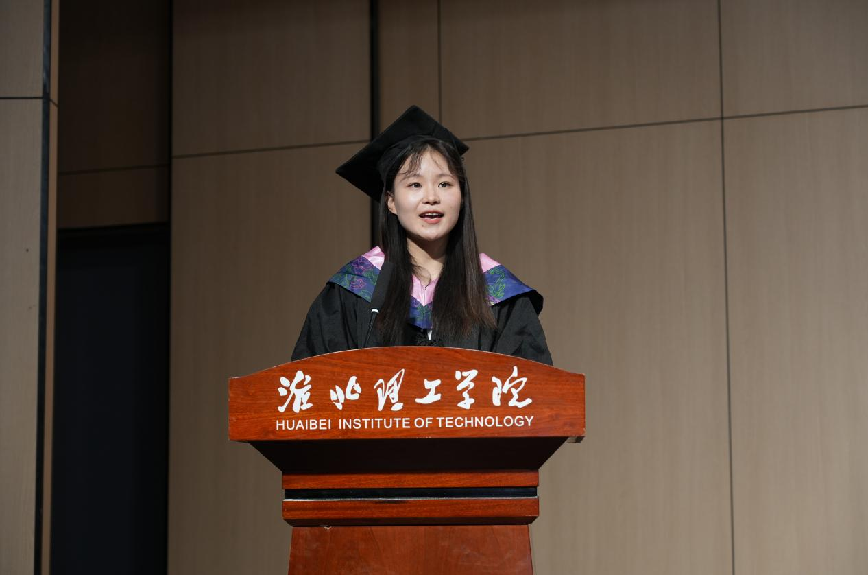 在毕业生代表发言环节,优秀毕业生代表费梦同学登台发言,在发言中深情回顾了在淮理工的成长历程。她细数了从教室、自习室、食堂和操场留下的奋斗足迹和青春欢笑,表示正是这些点滴让同学们从懵懂新生成长为有本领、有担当的毕业生。她表示未来将带着母校赋予的勇气与担当,用奋斗书写无愧于母校和时代的青春答卷。
