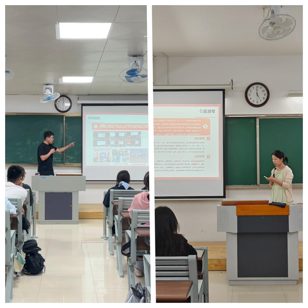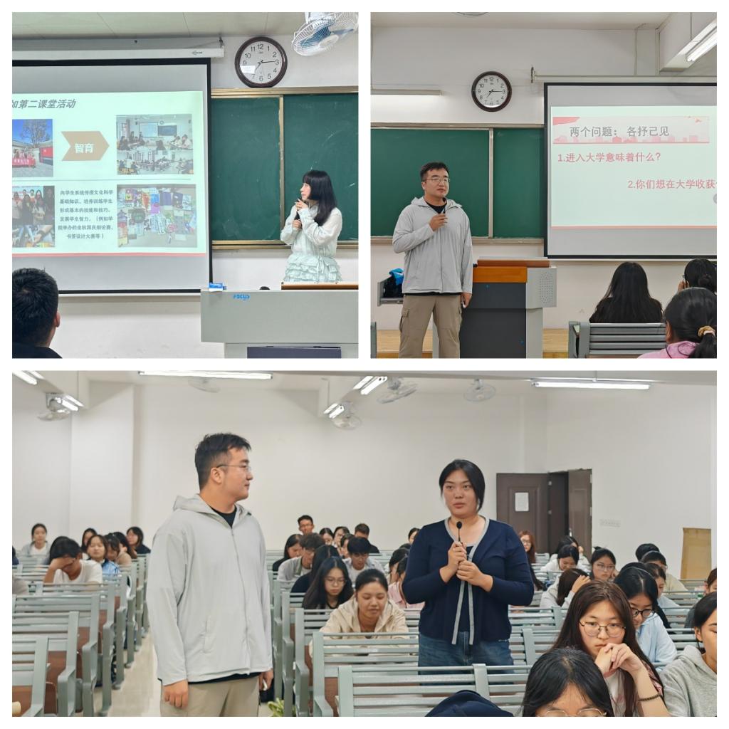 书记助理员禹辛和团总支书记王绎程围绕员工成长概况、成长认知、成长标准与成长路径等方面展开分享。他们结合多年教育经验,鼓励新生在认真学习专业知识的同时,积极参与A类、B类学科竞赛以及各类社团组织和志愿服务活动。通过竞赛锤炼创新思维和专业实践能力,在社团与服务中提升团队协作精神与社会责任感,同时注重发展个人兴趣与特长,努力成为德智体美劳全面发展的新时代青年。