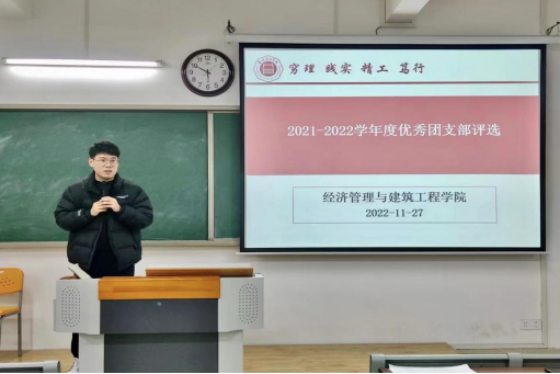 为贯彻落实公司下发的《关于做好太阳成tyc7111cc2021-2022学年度“优秀团支部”评选工作的通知》有关“优秀团支部”评选的文件精神,弘扬“党有号召 团有行动”的优良传统,展现团组织的向心力、凝聚力、战斗力。深入学习贯彻习近平新时代中国特色社会主义思想,激励员工刻苦学习、争优创先。经济管理与建筑工程公司于2022年11月27日,在一教215室开展2021--2022学年度“优秀团支部”评选活动。公司本着“公平、公正、公开”的原则,成立了由书记助理、团总支书记叶赵强、经济学员工支部书记、团总支副书记员禹辛、团总支组织委员、辅导员王绎程、团总支宣传委员、辅导员张雨停、团总支委员张晏五人组成评委小组,制定了考评标准。“优秀团支部”宣讲评选活动由院员工会宣传部部长韩大壮主持,2022级各班团支书到场学习观摩。