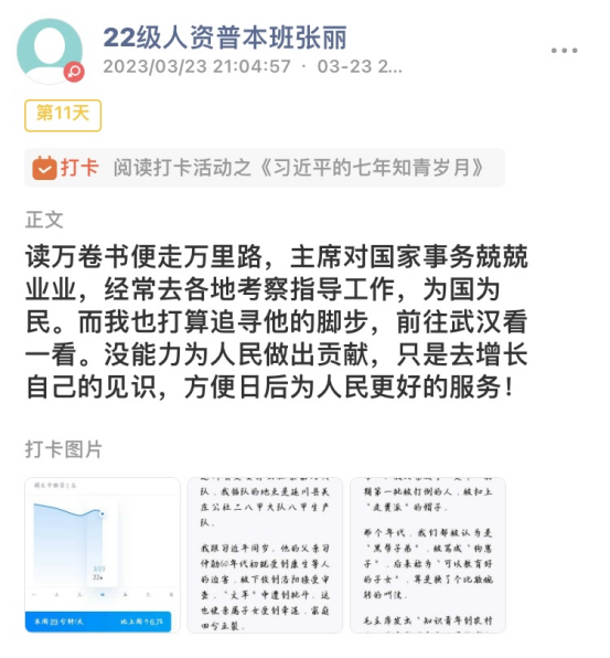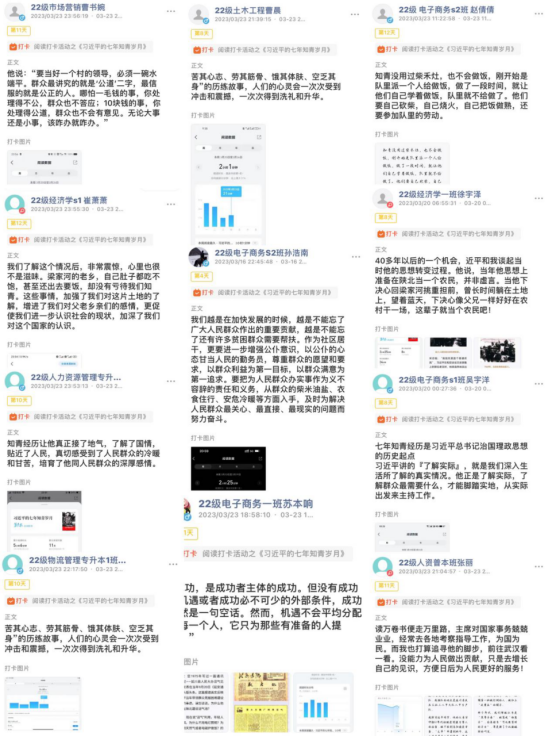 活动期间,读书打卡采取积分制,凡参加同学按时完成打卡,将读书笔记分享至线上平台。同学们通过微信读书app连续十二天阅读《习近平的七年知青岁月》,在阅读学习的过程中,许多同学都感受到了一种“相见恨晚”、“废寝忘食”的阅读体验,大家踊跃交流学习的心得体会,形成了“学习领袖青春故事、争做知行合一青年”的浓厚氛围。通过学习领袖的青春故事,同学们无不为其中所蕴含的视野、胸怀和境界所感动,大家积极表示要牢记总书记对广大青年所发出的“扣好人生第一粒扣子”要求,争做一名志存高远、脚踏实地、知行合一的青年。2022级电子商务一班苏本响同学就表示在阅读《习近平的七年知青岁月》过程中,对青春有了新的理解,人的一生只有一次青春,现在,青春是用来奋斗的;将来,青春是用来回忆的。只有进行了激情奋斗的青春,只有进行了顽强拼搏的青春,才会留下充实、温暖、持久、无悔的青春回忆。