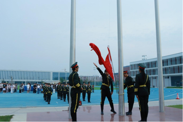 曙光初现,仪式上,英姿飒爽的国旗护卫队迈着矫健、整齐的步伐,护卫着五星红旗走向升旗台。伴随着庄严激昂的国歌响起,鲜艳的五星红旗冉冉升起。全体师生面向国旗肃立注目,爱国之情和强国之志在师生心中荡漾。