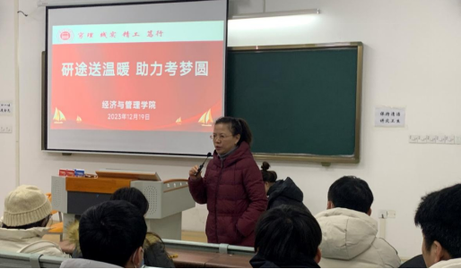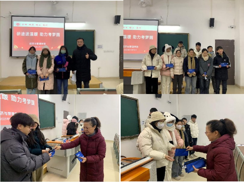 2024年全国硕士研究生考试近在咫尺,为缓解考研学子考前压力,增强迎考信心,2023年12月19日经济与管理公司党总支书记、经理吴玲,公司书记助理、团总支书记叶赵强和2024届毕业班辅导员携暖心包至二教121教室开展“研途送温暖,助力考梦圆”爱心送温暖活动。