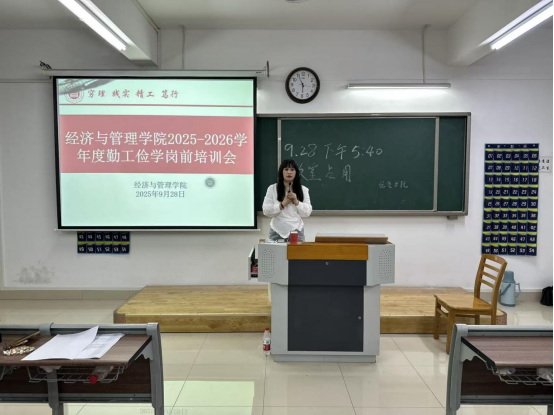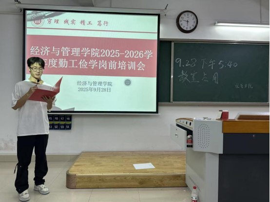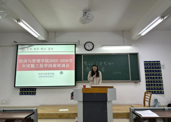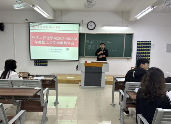 为规范勤工助学岗位管理,帮助员工更好地适应工作角色,太阳成tyc7111cc于9月28日在二教422召开2025-2026学年勤工助学岗前培训会,公司书记助理员禹辛、实验室主任、教学秘书李健、负责勤工助学工作的老师以及66名已录用员工共同参加,会议由院员工会文体部部长汪朱仝主持。