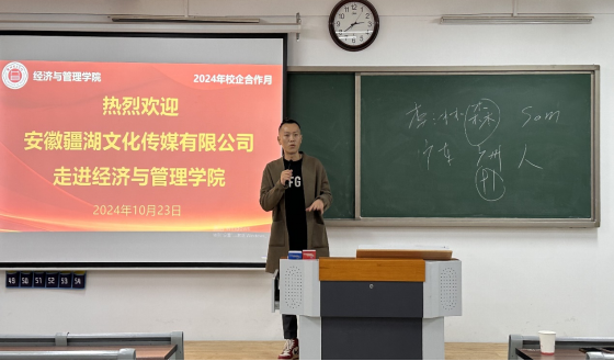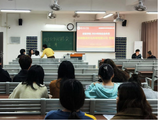 安徽疆湖文化传媒有限公司运营总监李林森先生为员工生动、详细的介绍了公司的发展史、公司的现有业务、公司的团队、招聘岗位、实习、就业待遇、未来职业规划等多方面进行宣讲,并通过生动有趣的视频让大家更好的了解公司。