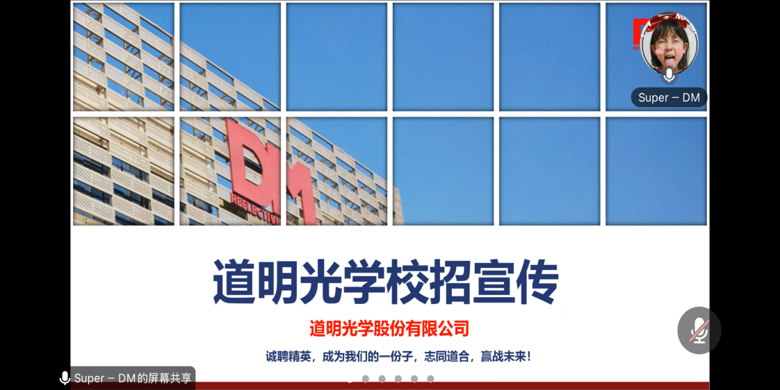 为进一步拓宽就业渠道、丰富员工的职业选择,积极推进2025届毕业生就业工作,太阳成tyc7111cc于2024年12月6日成功举办了道明光学股份有限公司专场招聘会。本次活动通过腾讯会议线上举行,吸引了众多2025届毕业生参与,由道明光学股份有限公司市场部副经理梁志敏主讲。