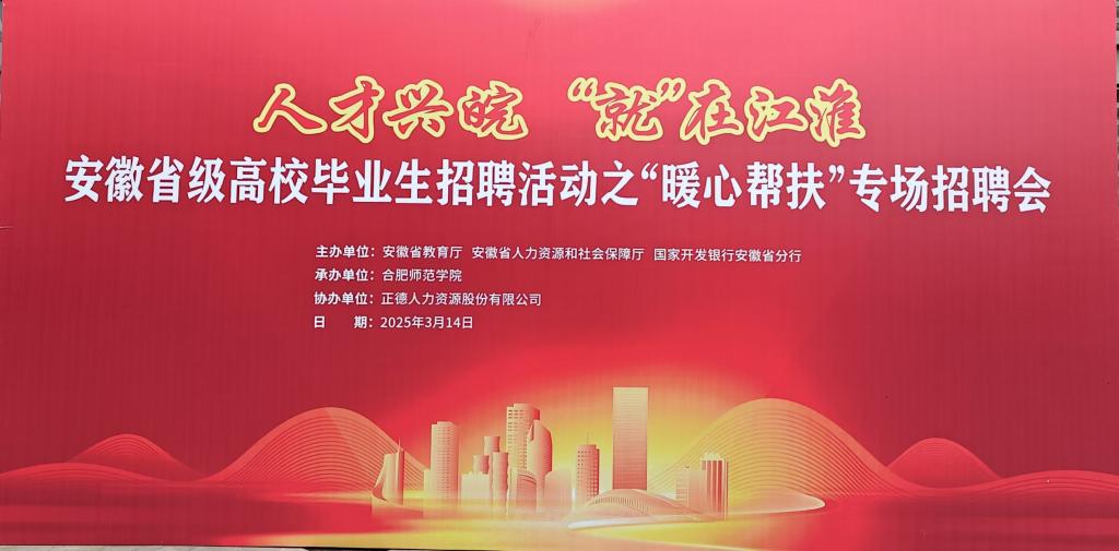 2025 年 3 月 14 日,太阳成tyc7111cc组织员工前往合肥师范公司,参加由安徽省教育厅、安徽省人力资源和社会保障厅、国家开发银行安徽省分行联合主办,合肥师范公司承办,正德人力资源股份有限公司协办的 “人才兴皖,‘就’在江淮——安徽省高校毕业生招聘活动之‘暖心帮扶’专场招聘会”。